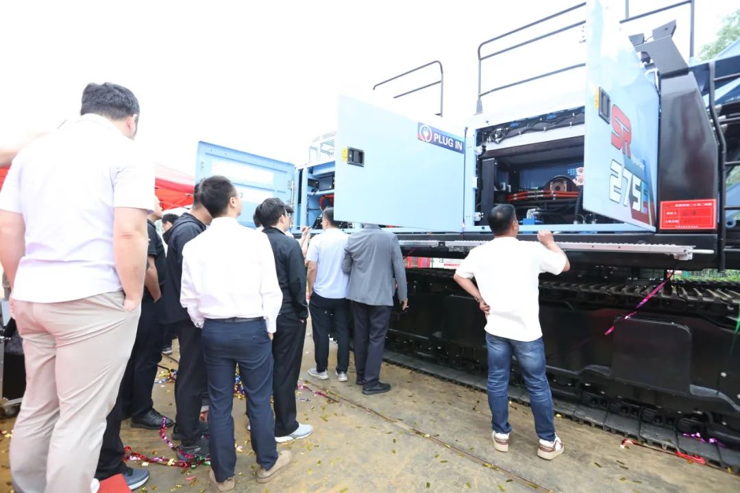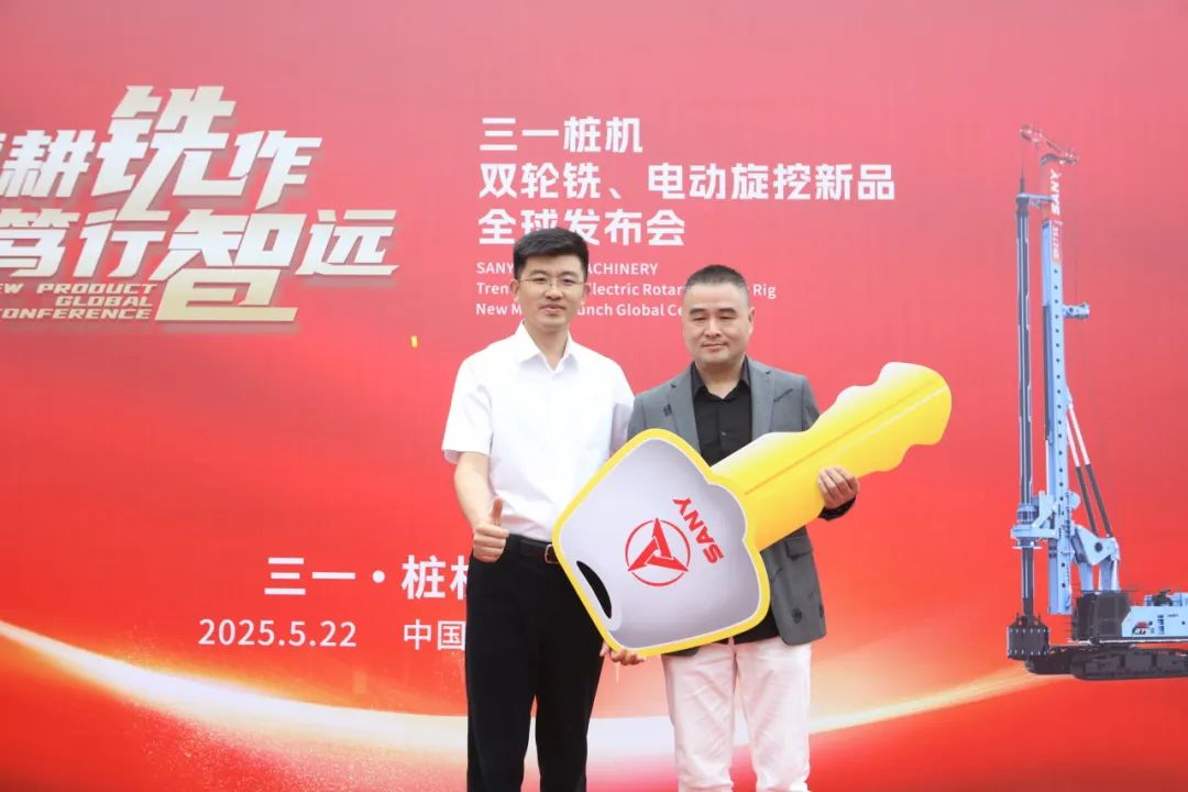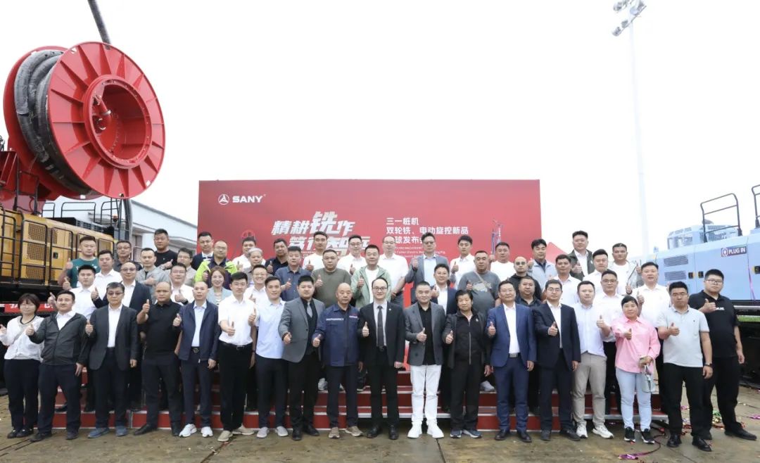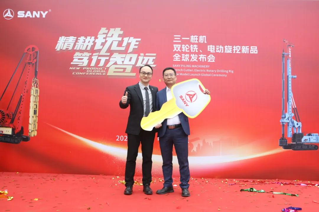 三一樁機公司領導與客戶代表共同按下啟動按鈕,SDC125雙輪銑和SR275E電動旋挖全球新品正式發布!現場彩帶飛揚、掌聲雷動。