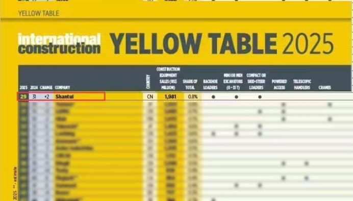 近日,英國KHL旗下《國際建設》雜志發(fā)布的2025年Yellow Table顯示,山推股份在全球工程機械制造商排名中從2024年的第31位上升至第29位,這一躍升不僅彰顯了山推股份在全球市場的競爭力,也反映了山推在2024年取得顯著成績。
