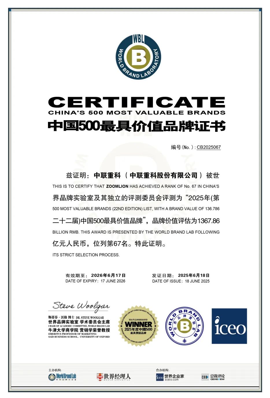 6月18日,由世界品牌實(shí)驗(yàn)室(World Brand Lab)主辦的第22屆世界品牌大會(huì)在北京舉行,會(huì)上發(fā)布了2025年《中國(guó)500最具價(jià)值品牌》分析報(bào)告,中聯(lián)重科以1367.86億元品牌價(jià)值登榜,在去年基礎(chǔ)上再次提升111.15億元,穩(wěn)健高質(zhì)量發(fā)展成效顯著。