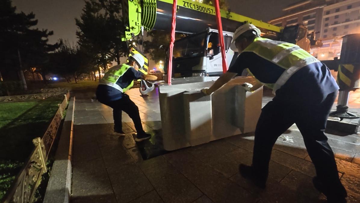 一次在閱兵村內進行模擬演練時,在前期索道設備安裝中,需臨時調整配重安置點,現場又沒有轉運設備,時間非常緊迫。中聯重科項目組迎難而上,用手抬、用肩扛、用撬棍撬,硬是將2噸重的配重合力移動200米,為索道安裝節點贏得寶貴時間。