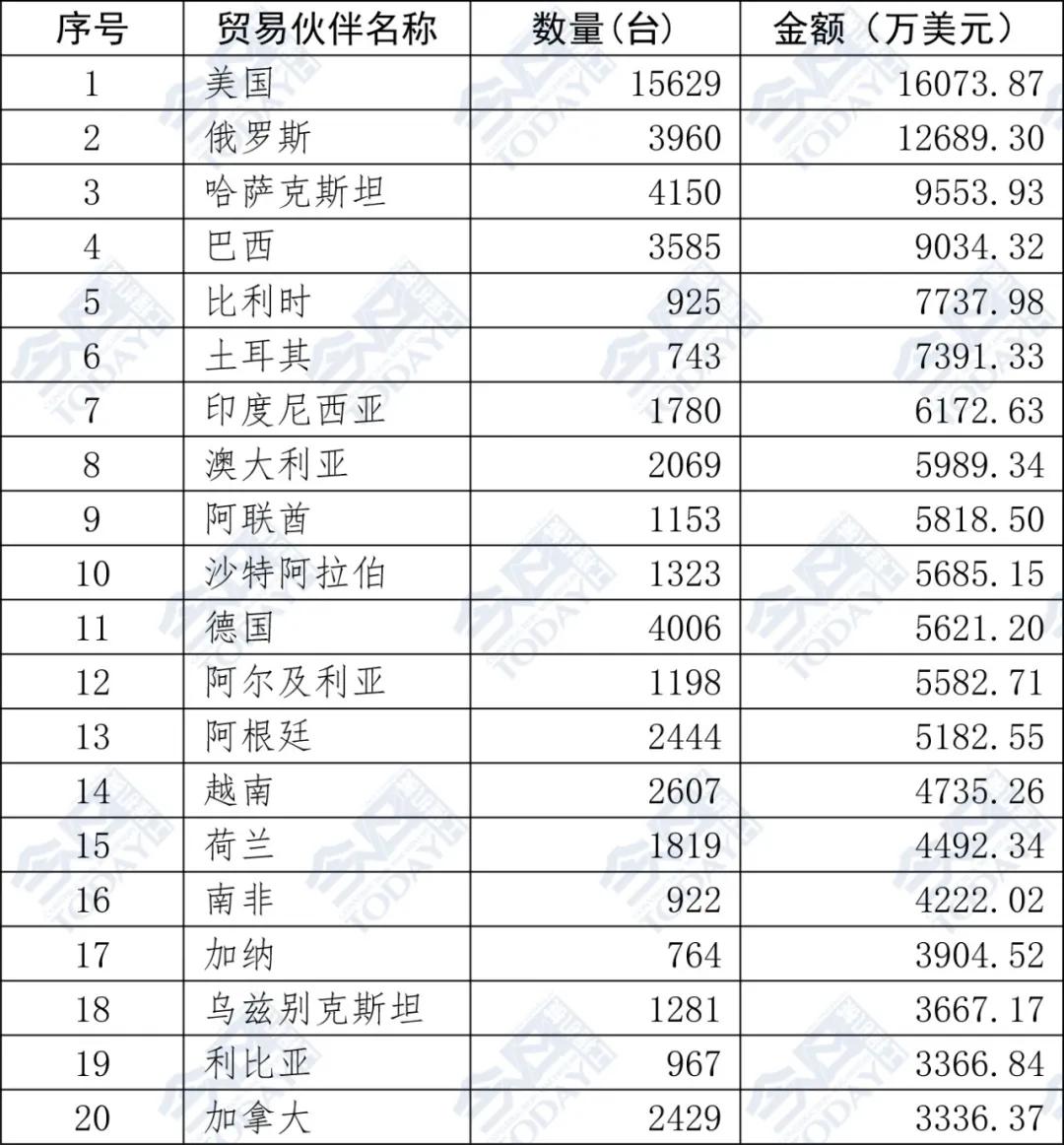 2025年1—7月,從我國裝載機累計出口額排名前二十位的國家來看,對美國、俄羅斯和哈薩克斯坦出口位列前三。其次依次為巴西、比利時、土耳其、印度尼西亞、澳大利亞、阿聯酋、沙特阿拉伯位列前十。具體情況如表3所示。