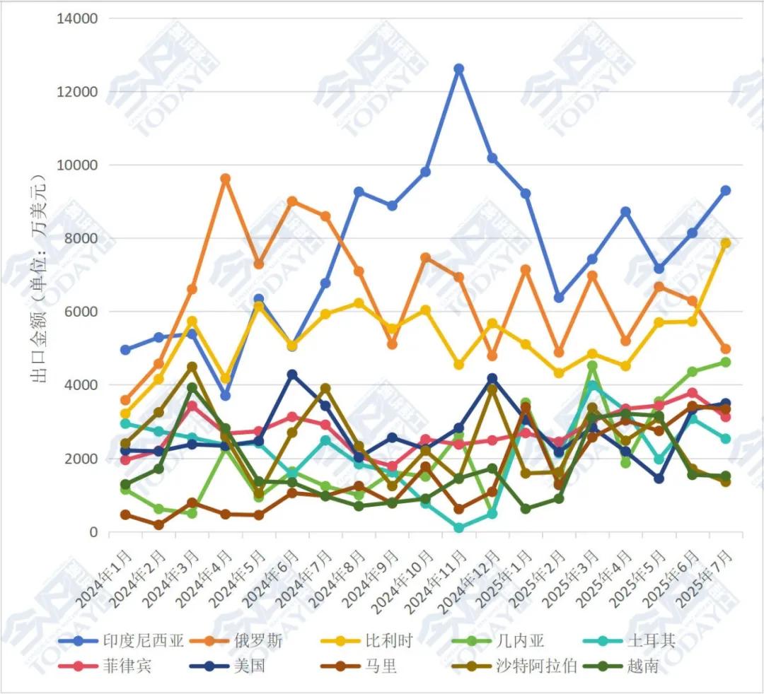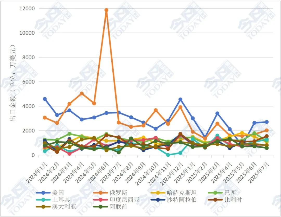 從2025年1—7月主要工程機械產品進出口貿易情況來看,對俄羅斯、美國、印度尼西亞出口金額排名位列前三,其次為巴西、沙特阿拉伯、印度、阿聯酋、澳大利亞、日本、越南。相較2025年1—6月的排名,巴西上升至第四。澳大利亞上升至第八,沙特阿拉伯下降至第五,日本下降至第九。