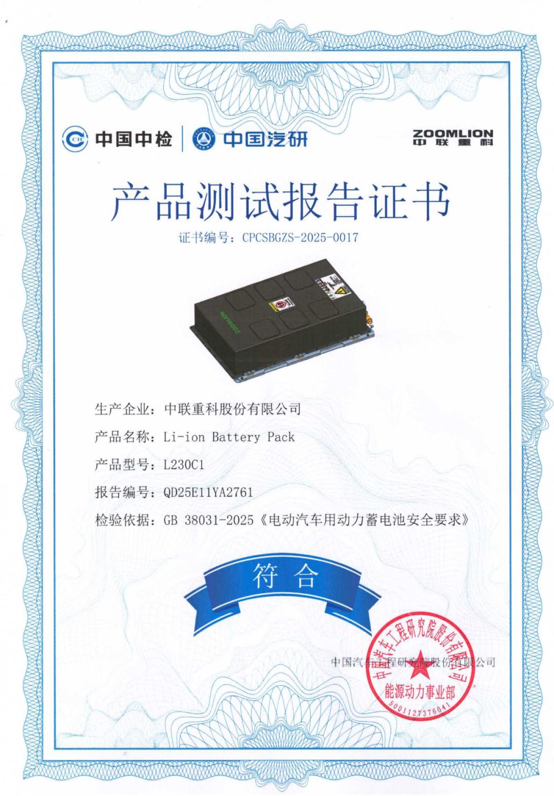 作為行業頭部企業,中聯重科具備了從“三電”核心零部件到系統集成再到整機全鏈條安全管控的能力,此次率先通過新國標認證,充分體現了公司在電池安全領域的硬核實力。當前,公司自研系列化動力電池已廣泛應用于純電動攪拌車、大馬力拖拉機、裝載機、寬體礦卡等多款道路與非道路主機產品,裝車累計行駛里程超百萬公里。