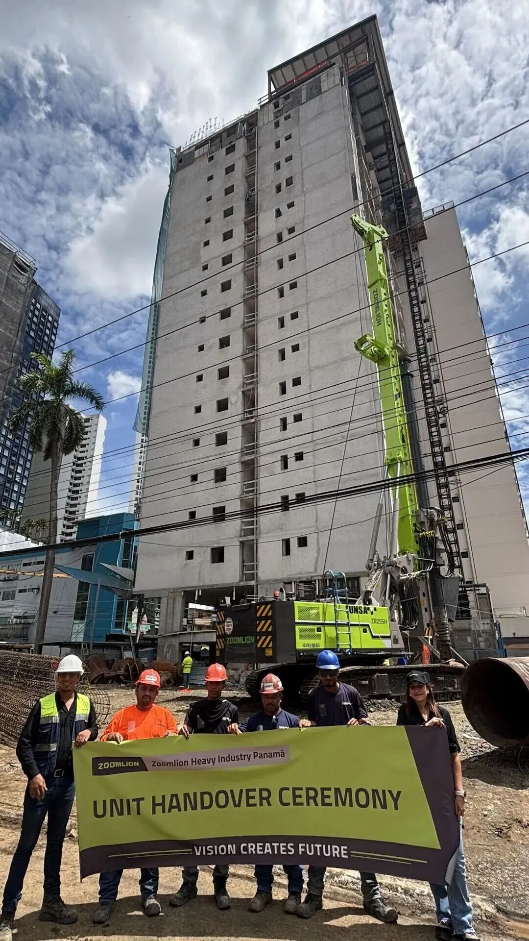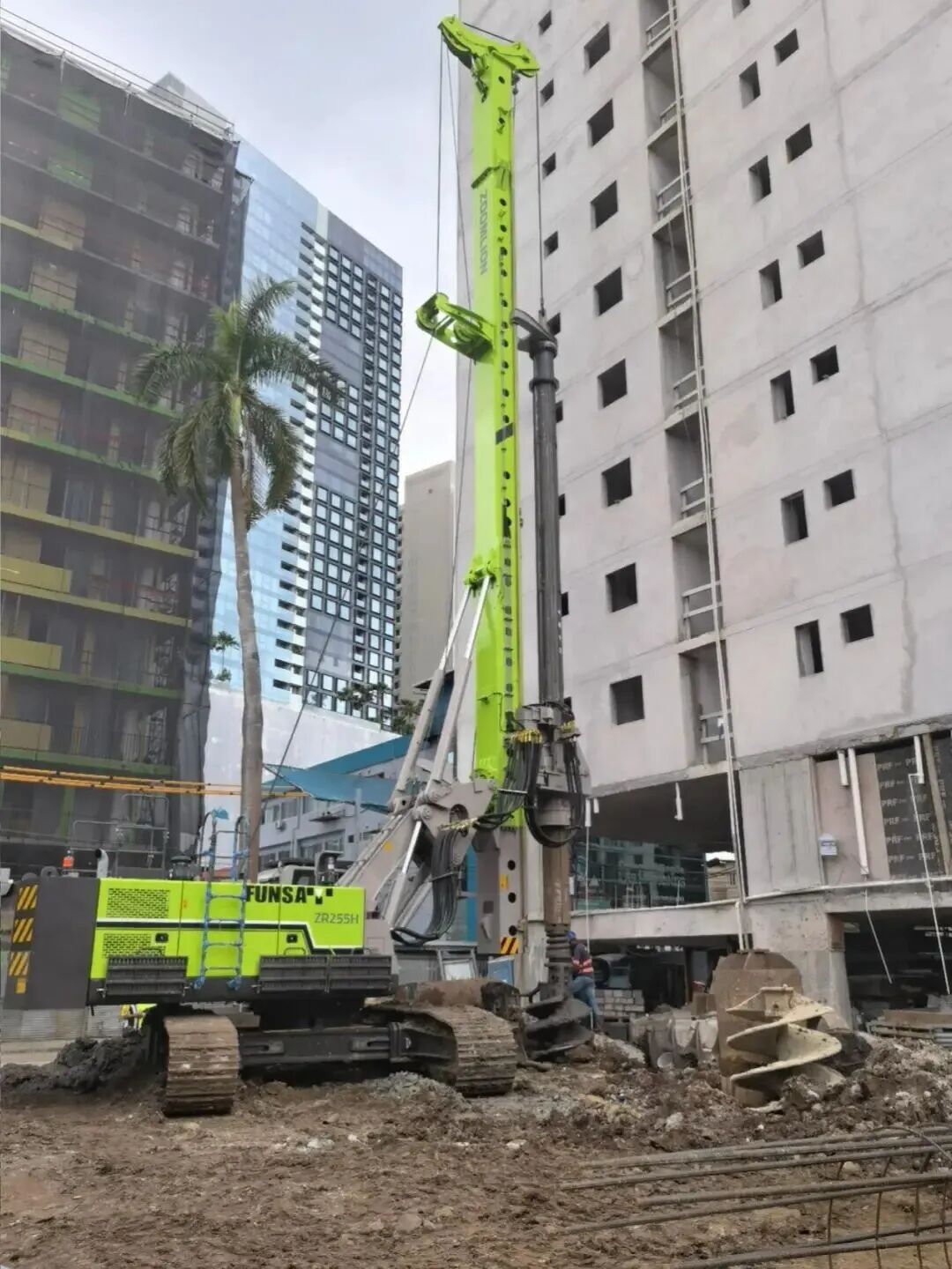 ZR255H旋挖鉆機首次投入巴拿馬城房建樁基礎施工,就展現出強勁的施工能力,高效完成直徑1.2米、深度25米的樁孔作業。項目地質以黏土為主,底部為強度約50兆帕的泥巖層,ZR255H憑借“軟硬兼施”的適應性,通過高效液壓系統兼顧施工速度與油耗控制,配合多檔位動力頭設計,輕松攻克強風化巖層,僅用3小時就完成單孔鉆進,效率令當地團隊驚嘆不已。項目方負責人不僅認可中聯重科產品,也高度肯定了公司的全程服務保障體系。