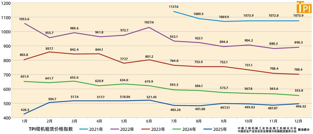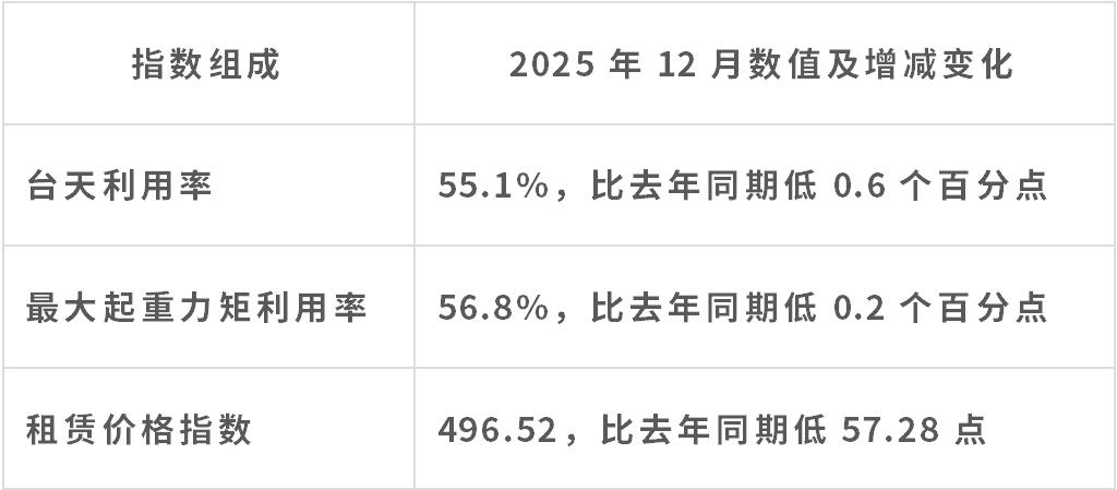 據中國工程機械工業協會施工機械化分會等統計的塔機租賃行業景氣指數(TPI),2025年12月份塔機臺天利用率55.1%,最大起重力矩利用率56.8%,分別較上月低2個百分點和1.5個百分點;12月份租賃價格指數為496.52點,較上月低5.65點,低于去年同期57.283點。