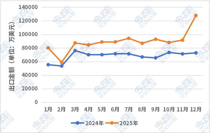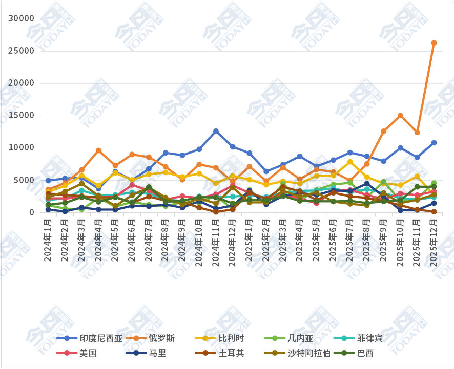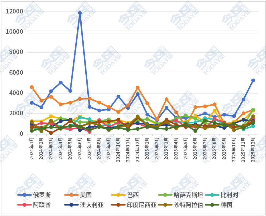 從累計(jì)出口額前十的國(guó)家來(lái)看,馬里雖然在2025年全年整體出口額中僅排在第七,但是其在12月表現(xiàn)十分亮眼,環(huán)比大幅增長(zhǎng)269%,擺脫了此前數(shù)月的溫和態(tài)勢(shì)。同時(shí)巴西同比表現(xiàn)也十分突出,與上年同期相比增長(zhǎng)182.85%。