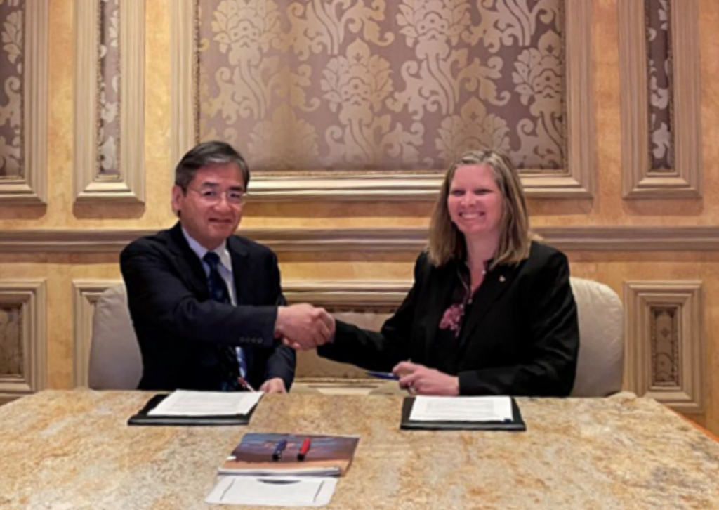 康明斯董事長兼CEO Jennifer Rumsey(右)與小松總裁兼CEO Takuya Imayoshi(左)在簽約儀式上握手